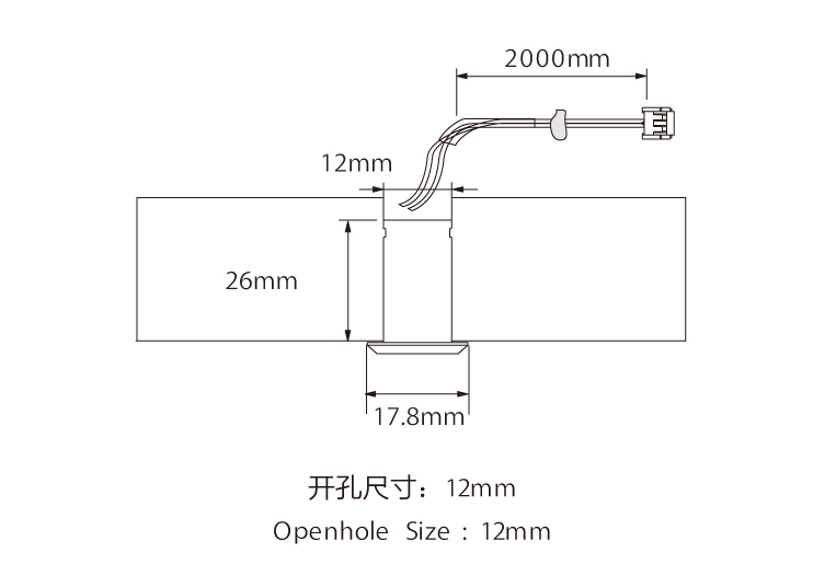 配置(Configuration):嵌入式红外手扫开关(不可调光),出线为2米24AWG黑色软排,带三线Mini公插头(过线开孔尺寸:8mm)。 型号(Model):BSS-HIRMA 颜色(Color):黑/白/银灰 输入(Input):DC12V